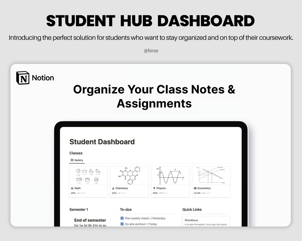 This pre-built template is designed to help students organize their classes, course notes, and assignments all in one place.